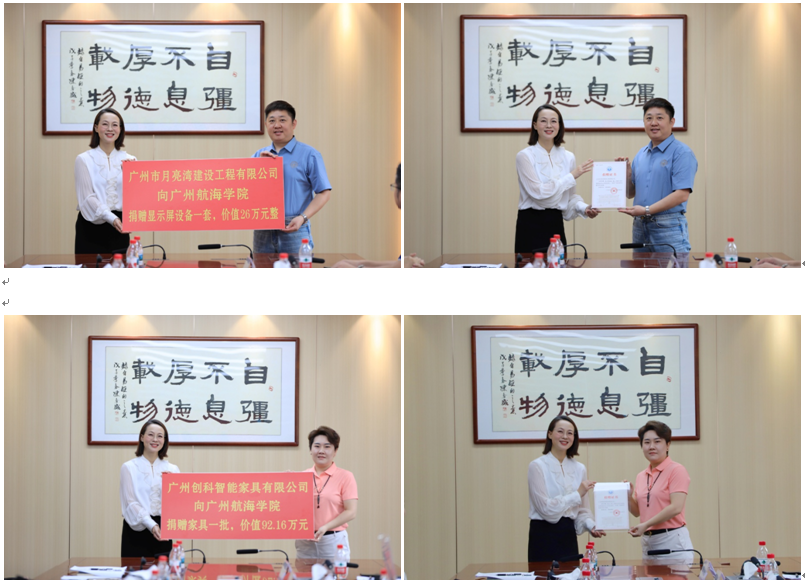 在本次集体捐赠活动中,中山校友分会向学校捐赠总价值20余万元的电子显示屏和伴手礼一批;广东省六七八控股集团股份有限公司与德润餐饮共同出资26.24万元,支持学校会议室升级改造并捐赠配套设备;广州市月亮湾建设工程有限公司为琶洲大礼堂捐建价值26万元电子设备;广东创科智能家具有限公司为郑和堂添置价值92.16万元的家具设施。学校教育基金会与各捐赠单位代表签订捐赠协议。陶韶菁代表学校接受捐赠,并向各单位颁发捐赠证书。